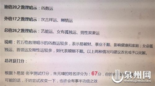经软件测分,“朱元璋”仅67分,而且是“凶数运”,被建议改名。