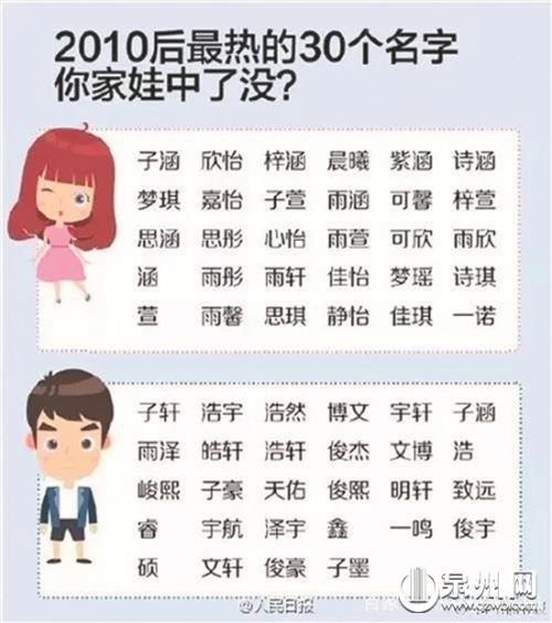 《人民日报》曾报道,2010后最热的30个名字,女孩以子涵、欣怡、梓涵、晨曦、紫涵、诗涵、梦琪、嘉怡、子萱、雨涵、梓萱、思涵、雨彤、一诺等名字最多;男孩以子轩、浩宇、浩然、宇轩、子涵、雨泽、皓轩、俊杰、子豪、宇航、泽宇、峻熙等名字最多。