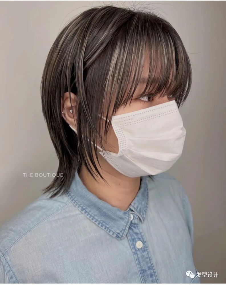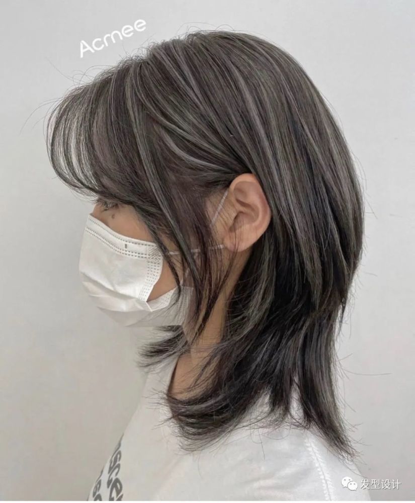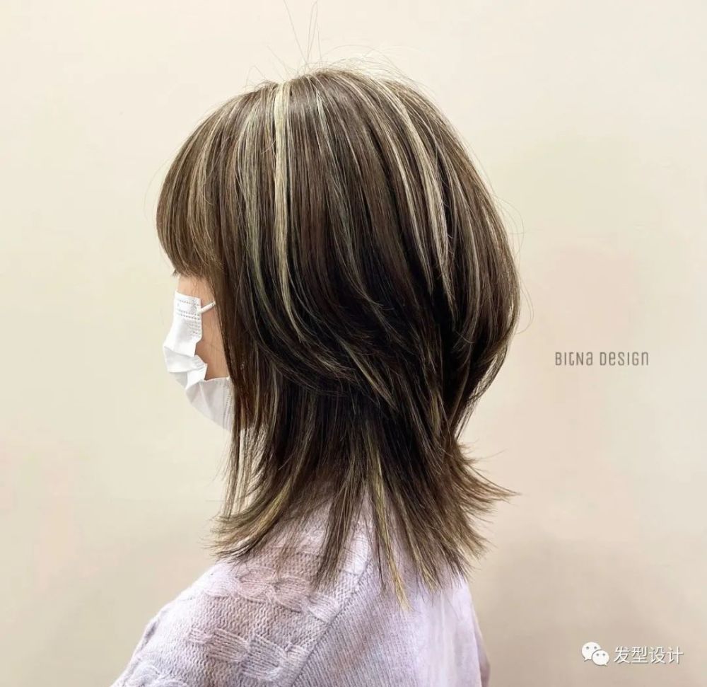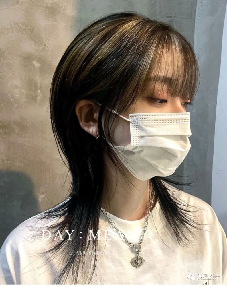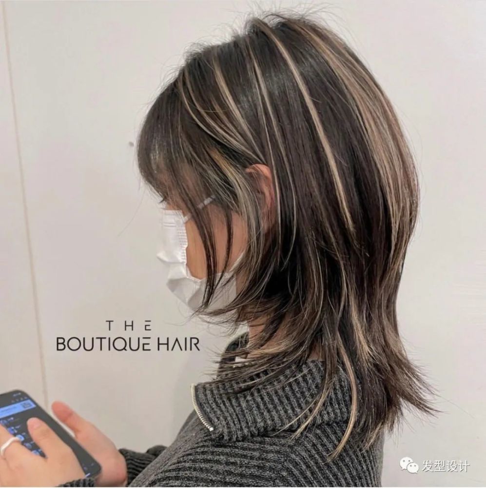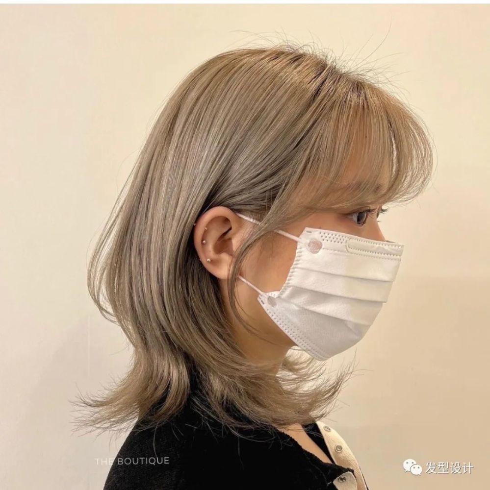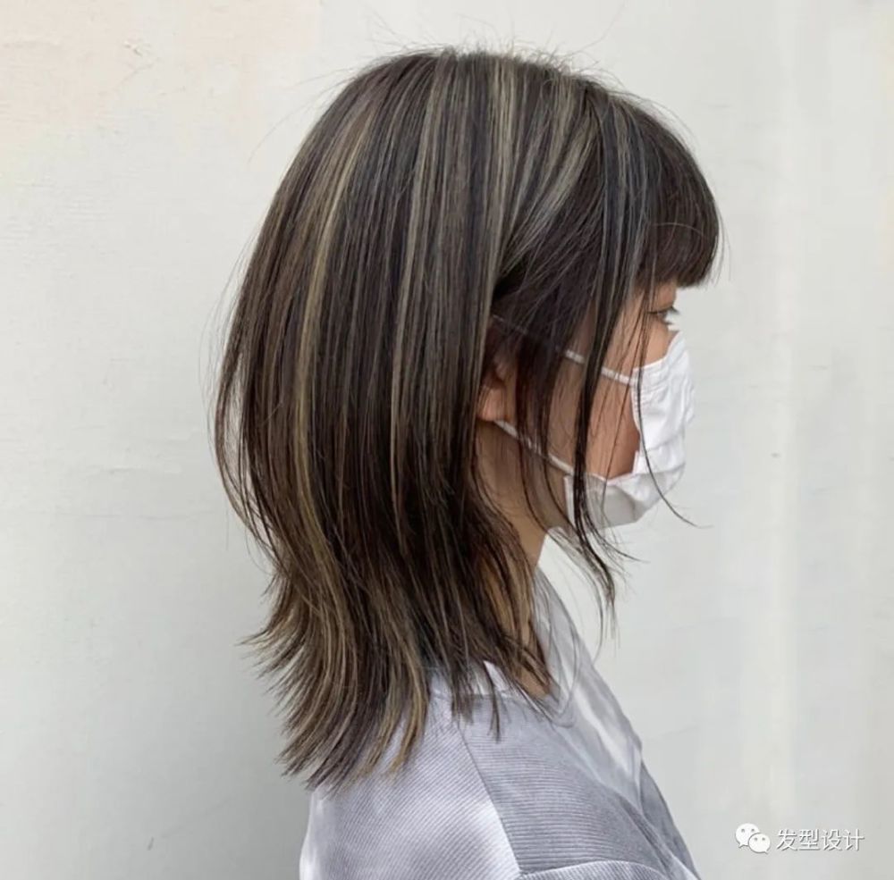 传统的搭肩发跟层次感小尾巴的碰撞,给人一种不一样的个性与魅力。搭配高级感满满的白金挑染色,真的很好看,刘海可以选择这种八字刘海的设计,修饰脸型,层次感的八字刘海设计可以很好的修饰颧骨,很适合颧骨高的女神,小尾巴搭肩发搭配这种冷色调的挑染发,给人整体的感觉会比较偏中性,所以就比较适合酷酷一点的女生,头发是尴尬期的女生可以尝试真的很不错。