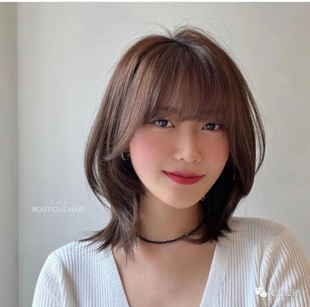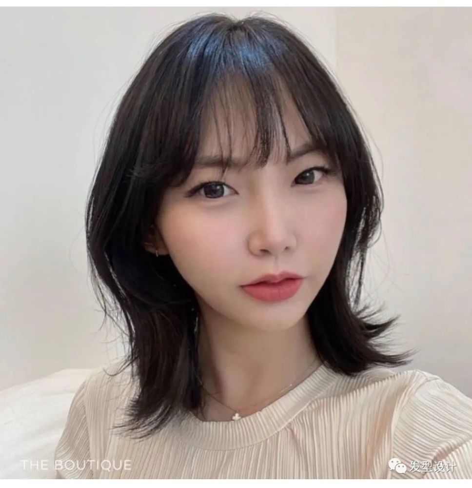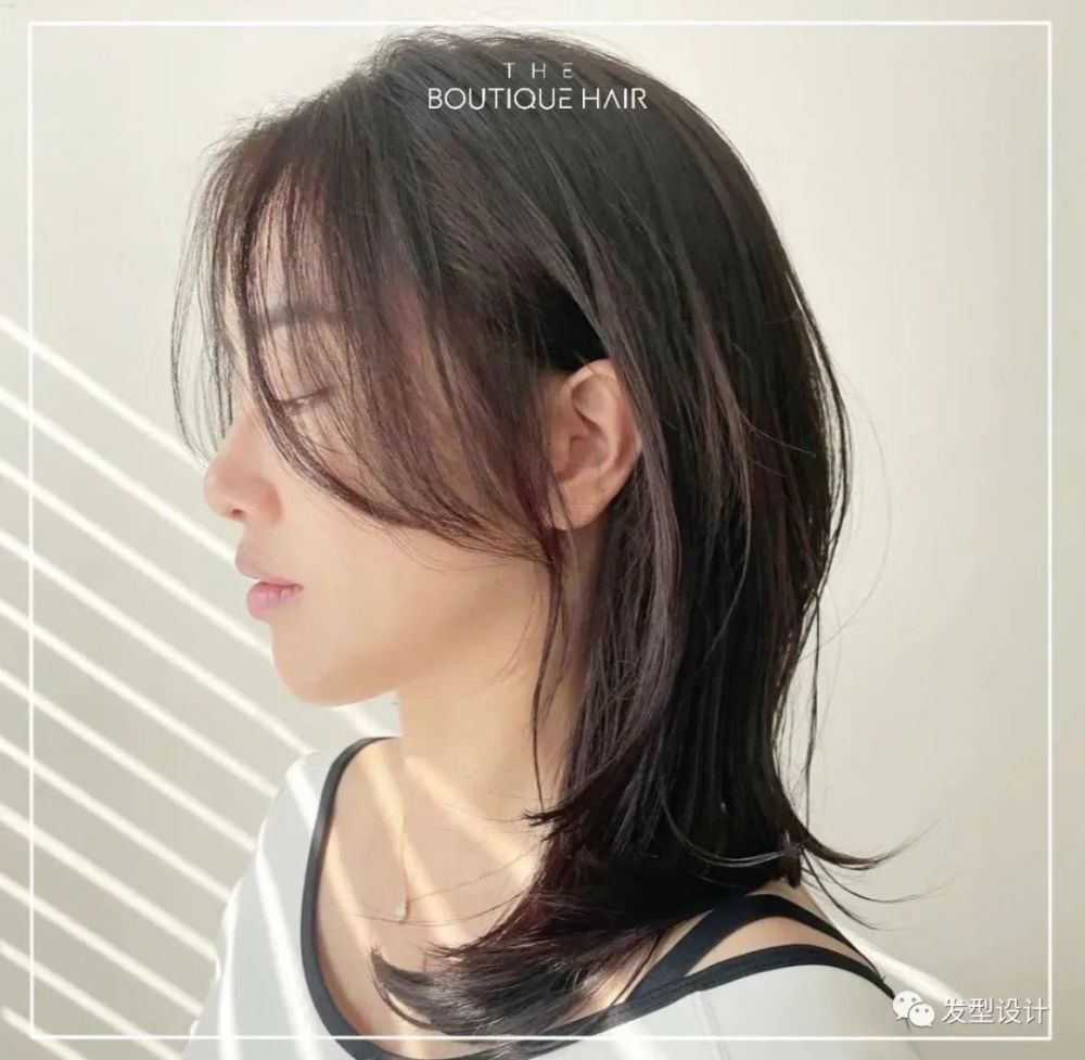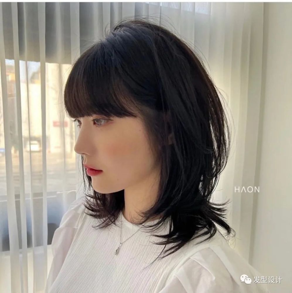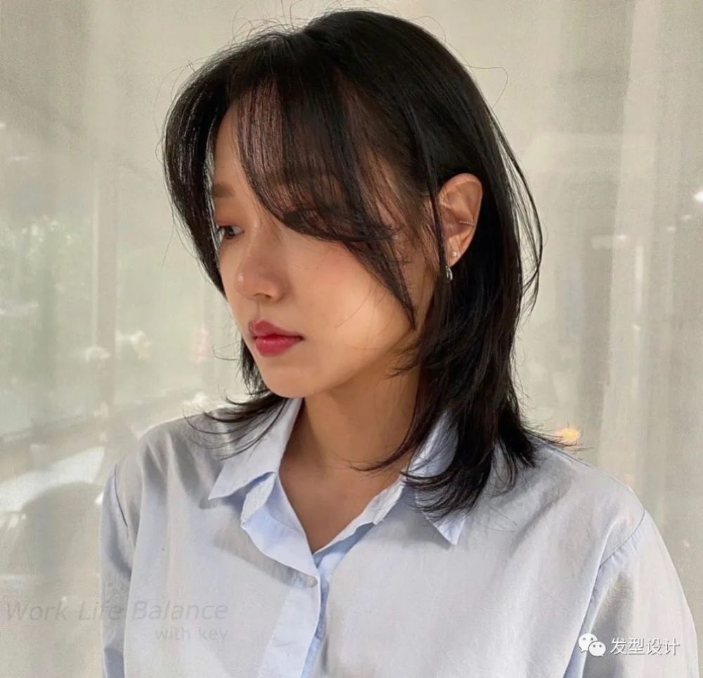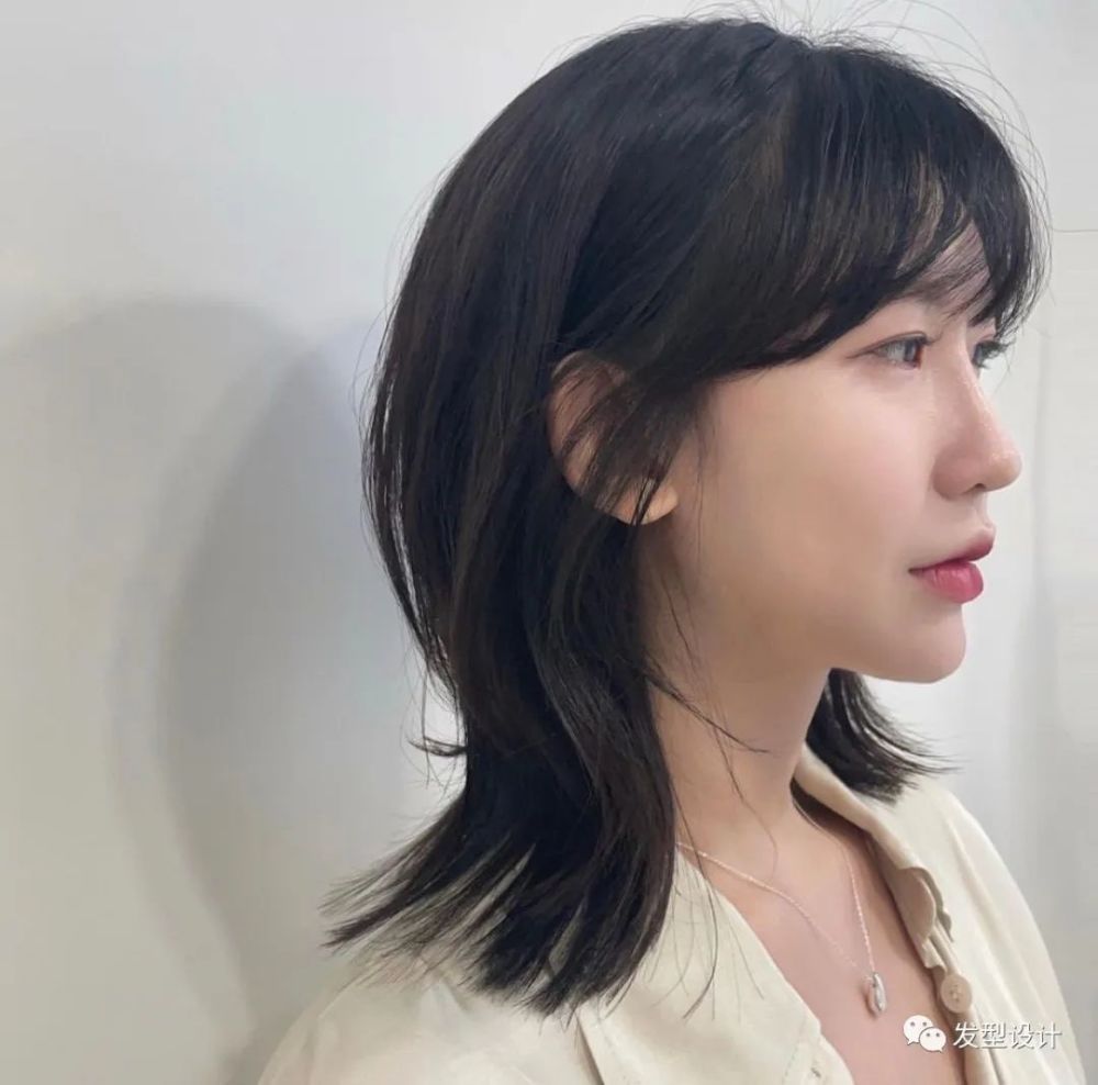 带点小尾巴的层次搭肩发,在发尾设计成有点外翘的形状,搭配显瘦减龄法式刘海,有点凌乱感的发型设计显得可爱娇羞,自然的黑发自然很显白,几乎适合所有肤色的女生,这款发型真的很适合发量多的女生,妥妥的气质高级感女神,上班白领气质绝配,刘海部分如果带点微卷更能修饰脸型,发色上也可以选择百搭显肤色的棕色系,好看时髦不显老。超级适合夏天哦。
