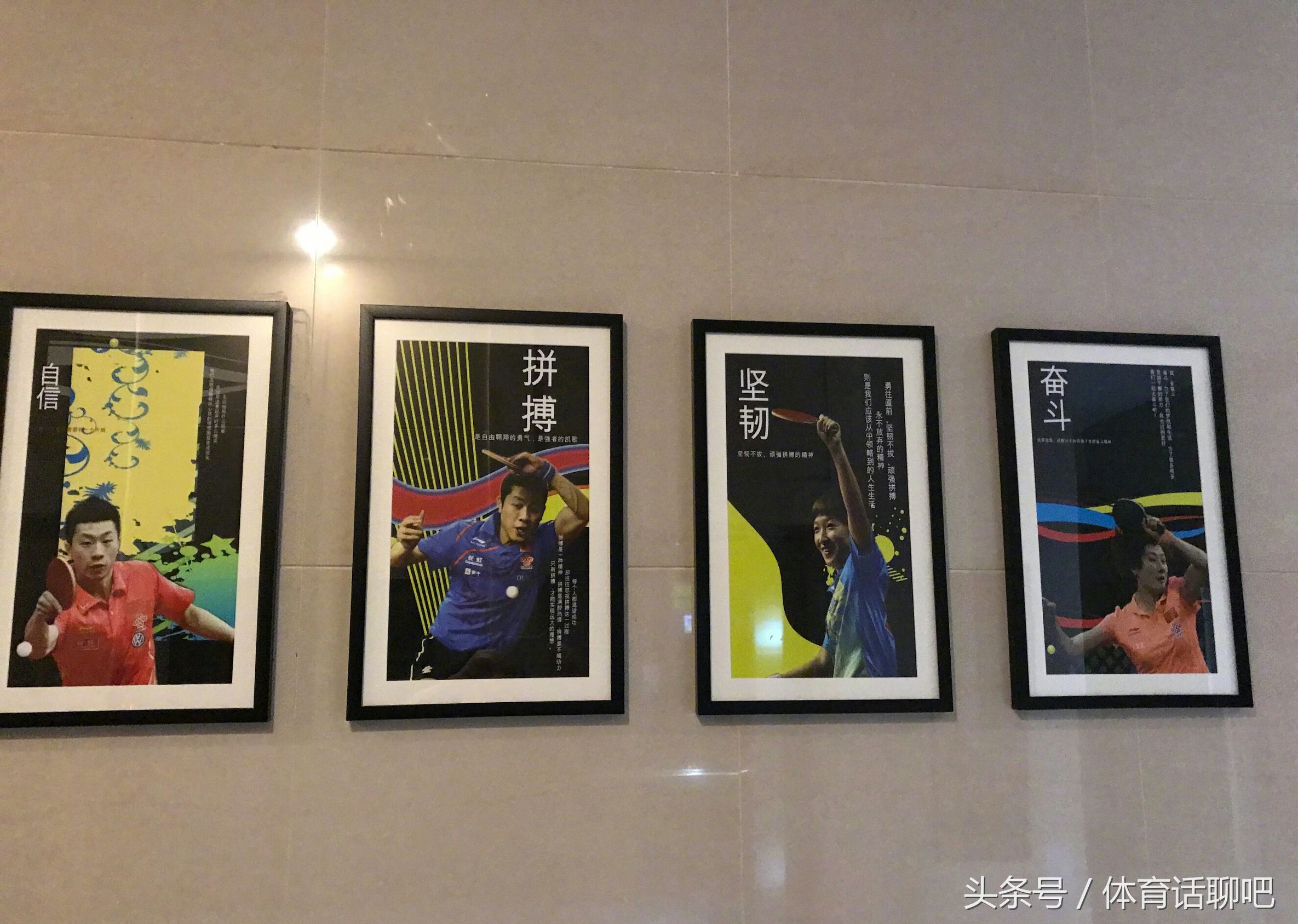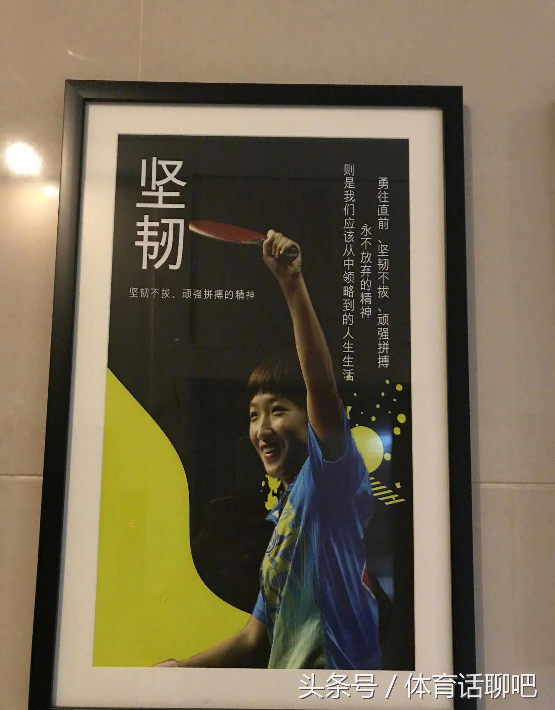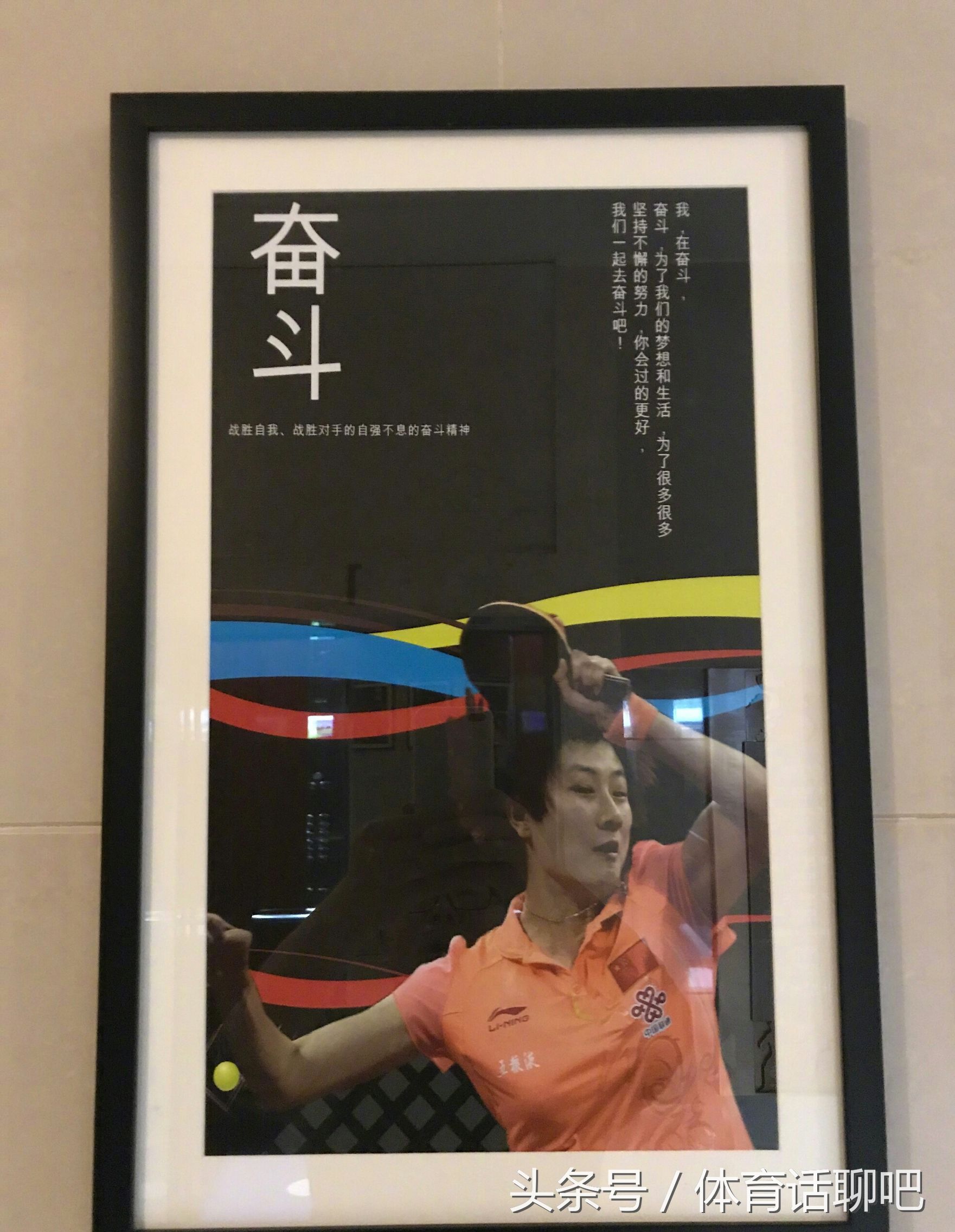 在国乒的训练馆的电梯入口,挂着八字箴言,“自信;拼搏;坚韧;奋斗”激励国乒。