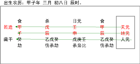 5、三元立命者,即是天干为天元,地支为地元,地支内藏之气为人元,如图: