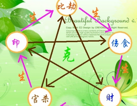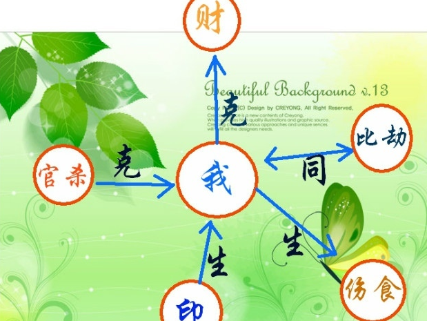 口决:我克者为正财偏财,克我者为正官七杀,生我者为正印偏印,我生者为伤官食神,同我者为比肩比劫。