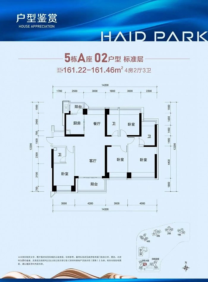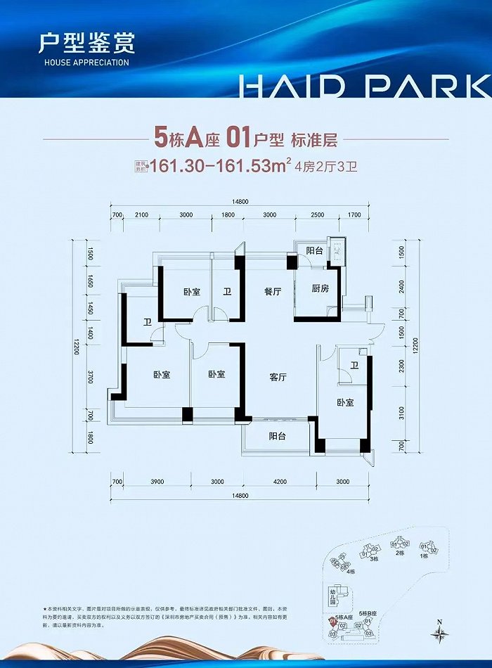 建面约161平方米的户型做了两个,都是四房两厅三卫。