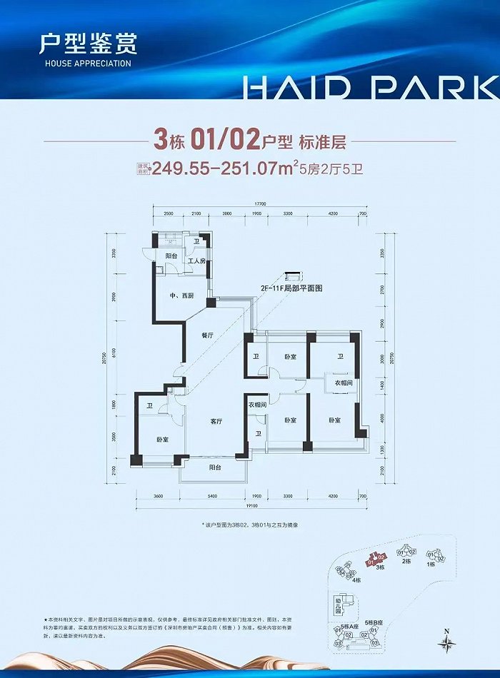 建面约249-251平方米的户型为五房两厅五卫,配备了工人房。