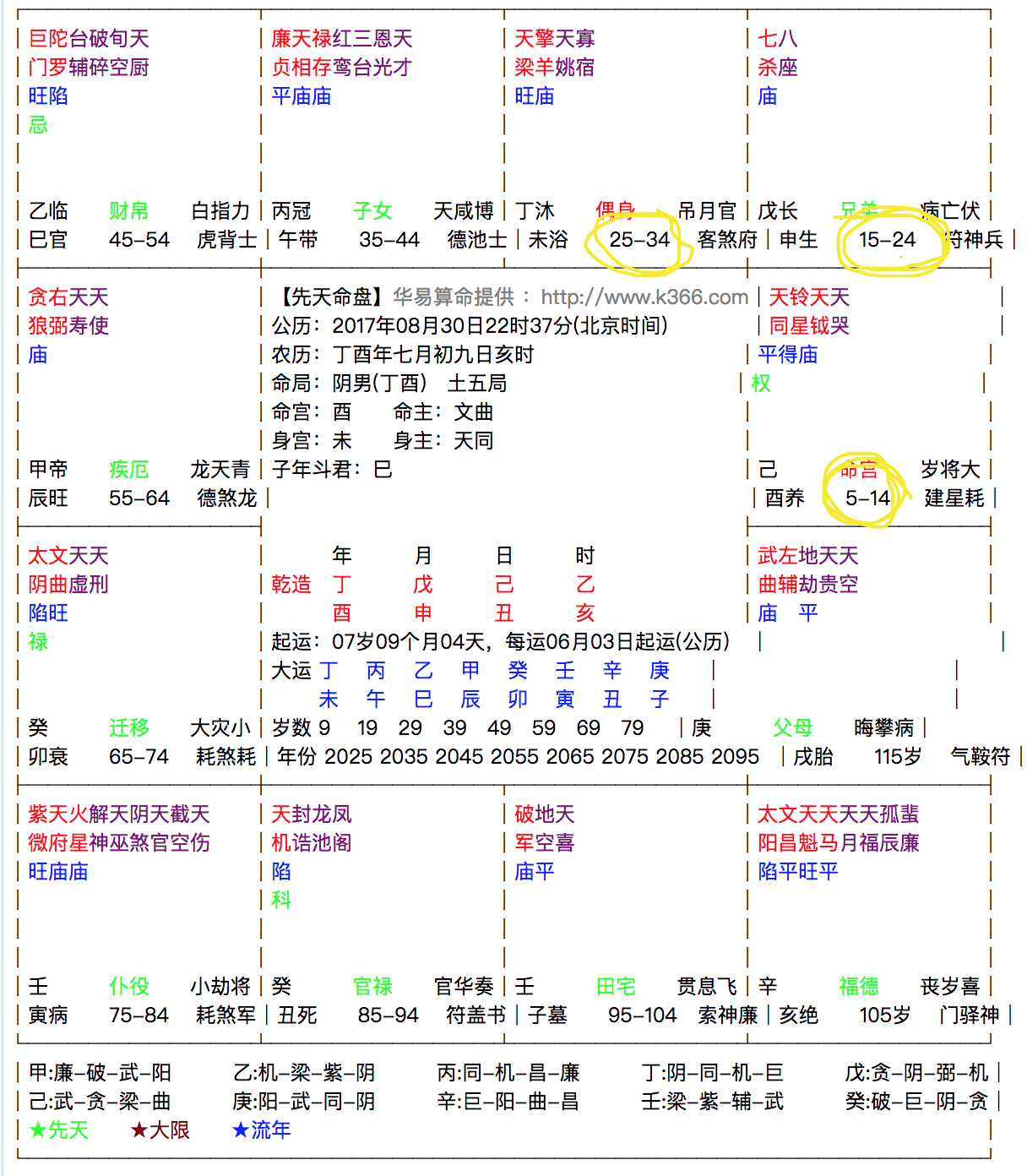 但是,不同的命理方法,排出来的大运是不一样的。比如还是这个男娃娃,拿紫微斗数排盘的话,是这样的: