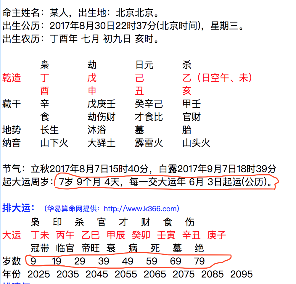 起大运的时间是周岁7岁9个月,交大运是每年的6月,所以他第一次交大运是在8岁那年的6月。图片底下写9岁开始走第一个大运,9岁是虚岁。这点大家要注意啊,八字排盘的大运时间,都指的是虚岁,也就是你实际年龄再加一岁。之后写的就很清楚啦,9岁~18岁一个大运,19岁~28岁一个大运……69岁到78岁一个大运。至于哪个大运好、哪个大运差,是之后要讲的内容了。