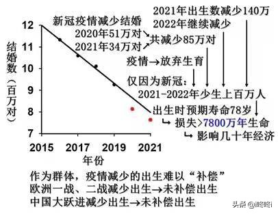 民政部年度统计季报显示,2016年、2017年、2018年、2019年结婚人数分别为1133万、1059万、1011万、926万。易富贤特别指出,如果没有疫情,按照线性下降公式,2020年和2021年的结婚人数应该分别是864万人和797万人;疫情导致结婚人数减少。2020年和2021年,实际结婚人数仅为813万人和764万人。这意味着疫情将使2020年和2021年的结婚人数分别减少51万和34万,共减少85万。再加上很多人放弃生育,疫情导致2021年和2022年有数百万儿童出生。
