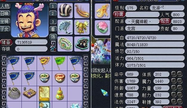咱就是175的低端五开,以前的阵容是女儿村、龙宫、普陀、化生以及神木林,很标准的3法2固伤阵容。主要刷的就是大小鬼、副本、周末活动,不刷天降,所以550速度绝对够用。唯一需要调整速度的是慈心的龙鸟。550速度开鸟阵很快,530速度有时候会不够。所以龙鸟应该是630速度左右。