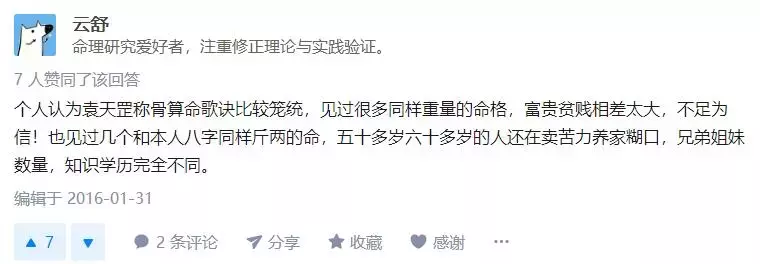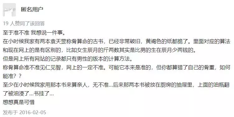 还有一名知乎上的@匿名用户并没有评论称骨算命的准确性,而是对目前网络上流传的称骨算命的测算方法产生了质疑。或许本来称骨算命是准确的,但是计算方法产生了错误,而导致了结果的不准确。
