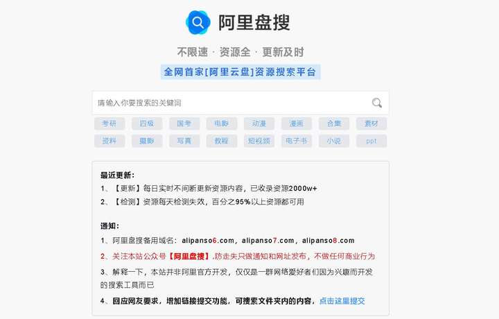阿里网盘一出生就不平凡,不仅空间大(免费用户至少可以免费领1T空间),而且上传下载还不限速,相比某度网盘难看的吃相,简直是良心到家了,现在已经有很多不错的资源已经转存到了阿里网盘,所以阿里网盘资料搜索引擎应运而生,本搜索已经收录2000w+资源,不需要登录和注册,搜索完成的结果直接是阿里网盘的下载地址,很方便快捷。