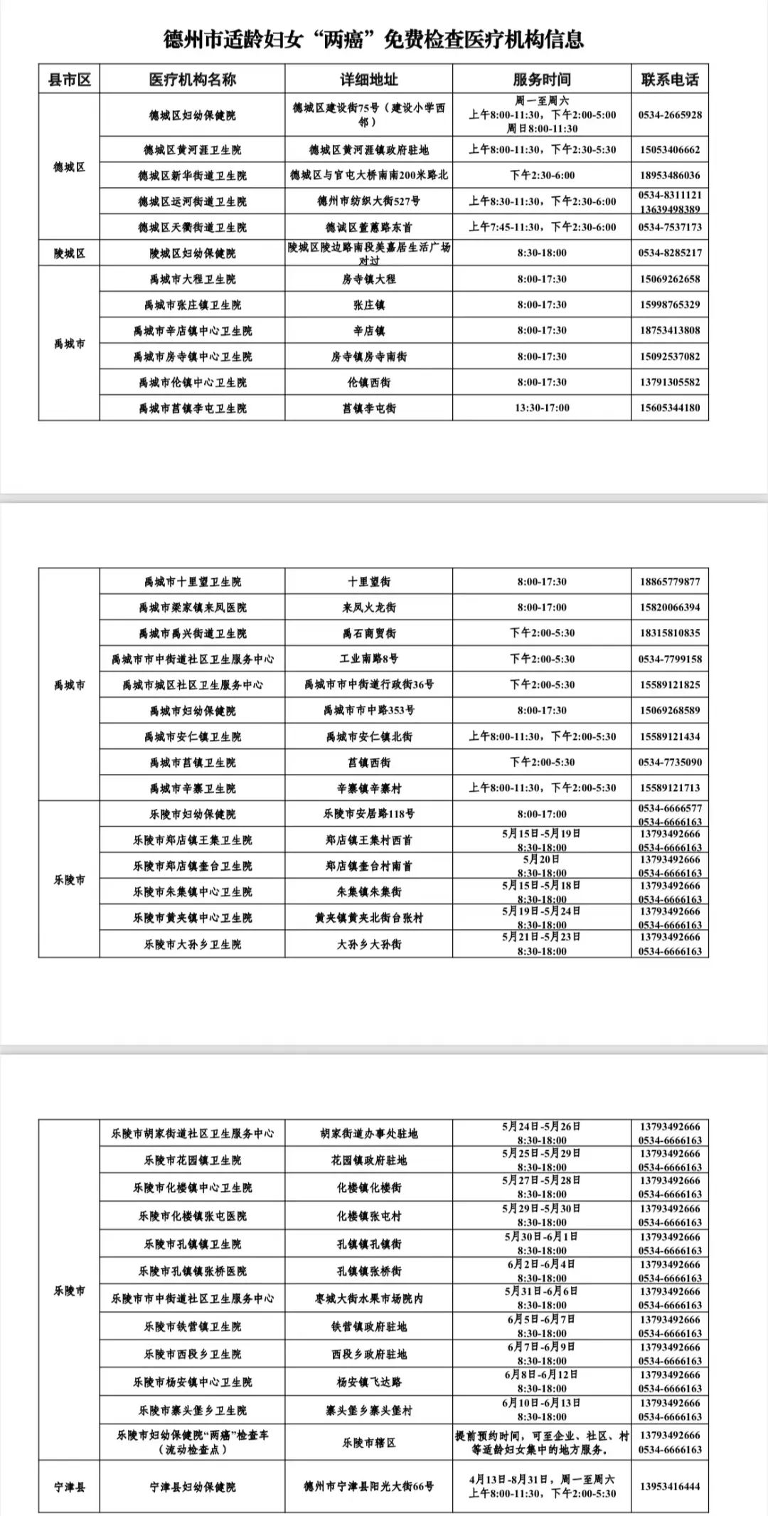 两癌免费检查自2020年起3年为一个周期,每周期内全市35-64岁农村常住人口和德州户籍城镇居民可免费参加1次两癌检查。