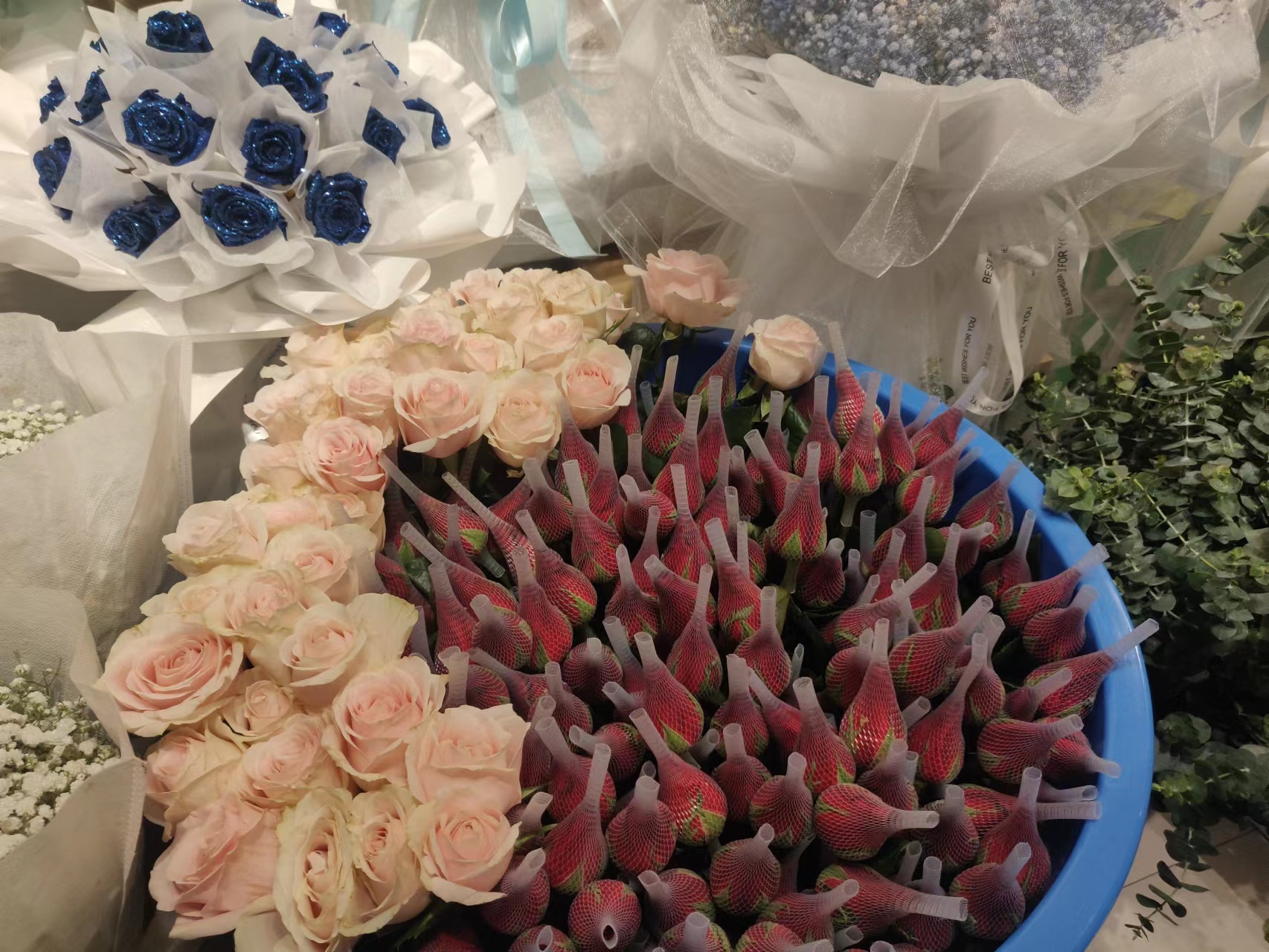 一到情人节,鲜花的销量就直线上涨。5月19日,记者走访长沙雨花区一家花店,店里大大小小的桶摆了满地,桶里插着新鲜到货的花朵。玫瑰、桔梗、芍药、向日葵……各种各样的花朵挤满了整个店铺。