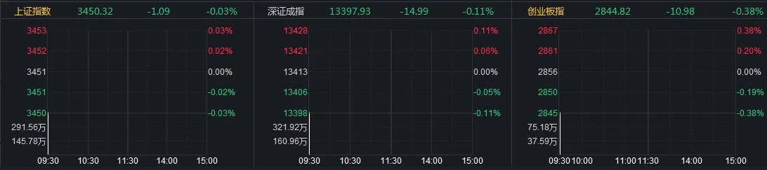 上证指数跌0.03%,报3450.32点,深证成指跌0.11%,报13397.93点,创业板指跌0.38%,报2844.82点,数字货币、中韩自贸区、微信小程序等板块领涨两市,杭州亚运会、东数西算(算力)、装配式建筑等板块跌幅居前。