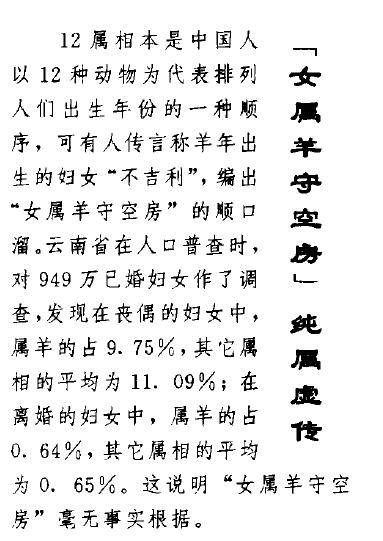 除此之外,早在上世纪90年代,就有媒体关注过"女属羊守空房"的说法,当时的数据显示: