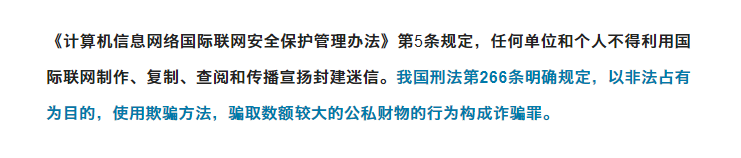 《计算机信息网络国际联网安全保护管理办法》第 5 条规定,任何单位和个人不得利用国际联网制作、复制、查阅和传播宣扬封建迷信。