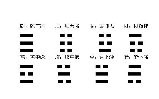 说到算卦,我们就会想到《易经》,就需要了解其中的八卦。八卦成列的基础是易象,重卦的基础则在于爻变,爻在其中矣便是易道周流的内在动因。每一卦形代表一定的事物,乾代表天,坤代表地,巽(xùn)代表风,震代表雷,坎代表水,离代表火,艮(gèn)代表山,兑代表泽。