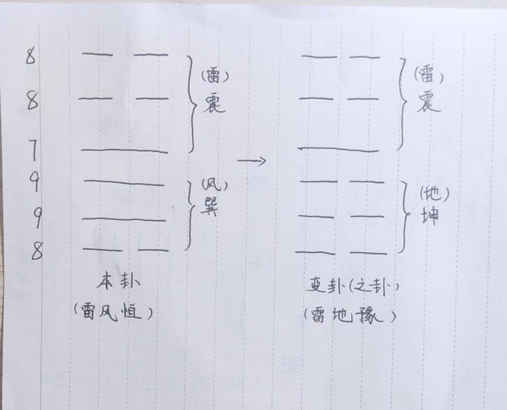 第三次同第二次,不过在最后我们需要在纸上记录挑出剩余纸后其余的以四张为一组会有几组,这便有了第一个数字,代表第一个爻,一个卦象有六爻,为了得到六个爻即记下六个数字,就需要按照刚刚得到第一个爻的方法再重复五次,每次结束都要把四十九张纸重新摞在一起,把得到的数字从下往上写在一张纸上。你得到数字应该是六七八九中某几个的组合,根据六八为阴爻、七九为阳爻,在七、九后面画——,六、八后面画--,可得到一个卦象,作为本卦,又因为六为老阴,九为老阳,六和九为变爻,所以所得数字如果含有六和九,则会通过变爻(阴爻变阳爻,阳爻变阴爻)而得到一个新的卦,即变卦(或之卦)。以我得到的卦为例