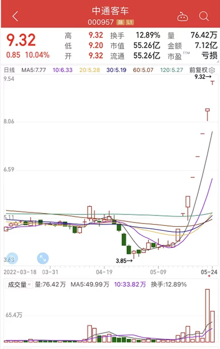 但是,近期的汽车板块龙头中通客车则逆市涨停,实现8连板。