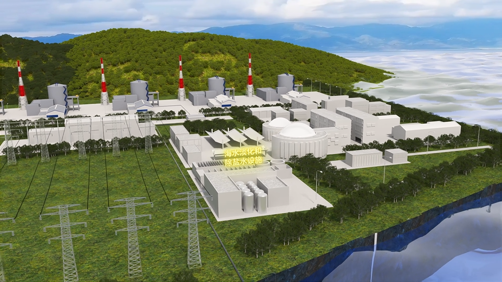它采用三个回路蒸汽转换方案,一回路产生的热量通过蒸汽发生器加热二回路的水,产生高温高压的蒸汽;通过抽取部分蒸汽,在换热站中将海水淡化厂生产的淡水加热成为符合工业标准的蒸汽。加热后的蒸汽经过三回路管网传送到用汽端。