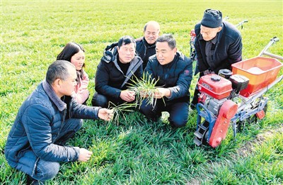 2月20日,在安徽省亳州市谯城区赵桥乡双楼村,科技特派员(右2)在田间为农民进行小麦春管技术指导。 刘勤利摄(人民图片)