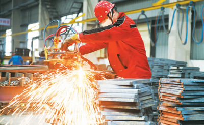 2月18日,安徽省阜阳市颍泉经济开发区中源智能化制造产业园钢结构加工车间内,工人正进行数控切割作业。 王 彪摄(人民图片)