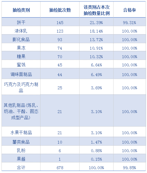 安慕希酸奶、旺仔牛奶、妙可蓝多奶酪棒、法丽兹曲奇、源氏大刀肉、卫龙亲嘴烧、旺旺小小酥、mm豆、健达巧克力、浪味仙……商场超市、小卖部内琳琅满目的零食,统统被实验室收入囊中。本次抽检共覆盖乳制品、方便食品、饼干、薯类和膨化食品、糖果制品及水果制品等6大类食品,678批次,发现1批次饼干不合格,总体合格率99.85%。