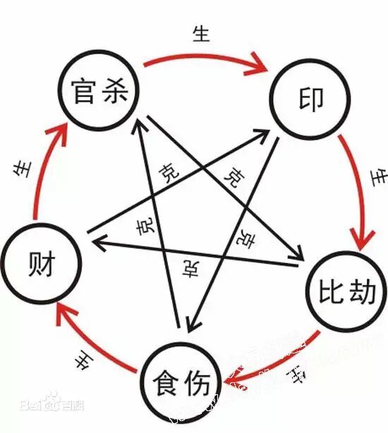 十神生克关系,比劫生食伤,食伤生财,财生官杀,官杀生印,印生比劫。比劫克财,财克印,印克食伤,食伤克官杀,官杀克比劫。