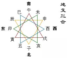 地支三合,四个三角形,申子辰合水,亥卯未合木,巳酉丑合金,寅午戌合火。