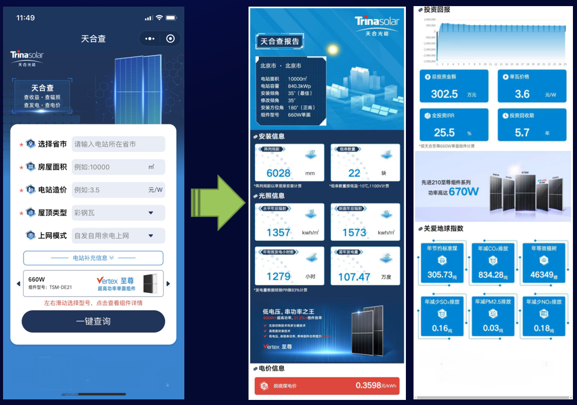 针对目前市场与行业环境的需求,天合光能最近在其主题为600W+开启效率革命--为零碳新时代赋能的发布会上,推出了一款名为天合查的微信小程序。这个小程序拥有查投资收益、查辐照强度、查发电功率、查实时电价等功能,让各行业用户都能根据自身需求,选择对应的省市、房屋面积、电站造价、屋顶类型、上网模式以及对应的组件型号等组合选项,一键精准获取投资回报率以及各项安装数据。