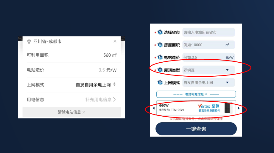 从上图举例可见,与其他查询工具相比,天合查从底层计算逻辑上增加了屋顶种类与产品型号两个分布式光伏中的重要选项,因此计算出来的数据更加精准与专业。并且在后续的安装方案中,天合光能还会针对得出的数据用云更为适配的落地方案。