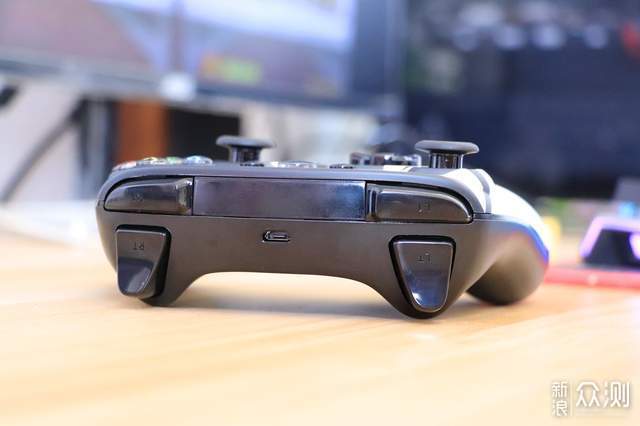 莱仕达PXN-P20游戏手柄顶部是四个肩键,采用与机身相同的黑色,显得比较沉稳低调,中间是一个Micro-USB充电接口,如果设计为Type-C的接口就更好了。