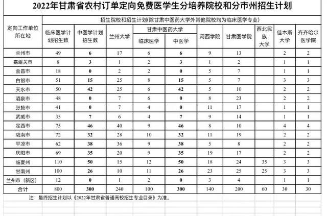 6月12日,记者甘肃省教育考试院了解到,2022年甘肃省农村订单定向免费本科医学生计划招生1100名(临床医学800名,中医学300名),其中,兰州大学240名,甘肃中医药大学400名(临床医学100名,中医学300名),河西学院140名,甘肃医学院200名,西北民族大学60名,佳木斯大学30名,齐齐哈尔医学院30名。
