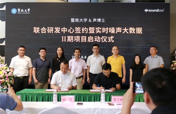 签约仪式上,暨南大学与番禺区石楼镇企业声博士正式成立联合研发中心,共同推进无基站式实时噪声大数据Ⅱ期研发项目。据悉,该项目是基于移动手机端采集的噪声数据,经过特定算法对基础噪声数据进行分析处理,分辨并剥离出有效噪声和假象噪声,以及对不同噪声源通过声纹识别后的分类。通过数据加密,噪声源采集仅基于声压和频响数据,数据集束后再进行二次加密,从而保障数据符合规范和不可逆转性。