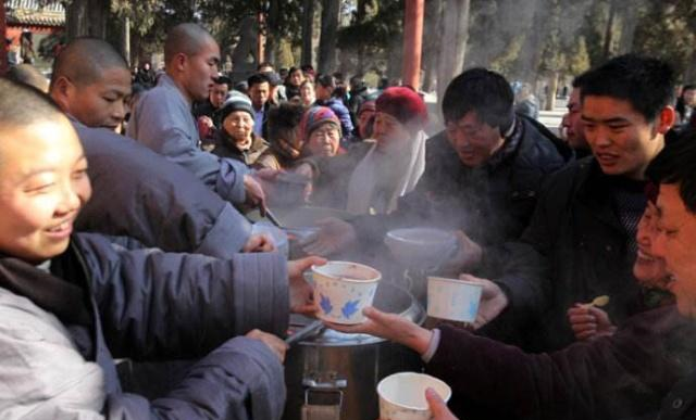 少林寺每年腊八节这一天施粥是从元代就已经开始,后来经历战乱一度被终止,但是从08年之后,又开始在腊八节这一天开始施粥,这也使的这一经典的传统文化得以延续,不得不说是一件功德无量的事情!除了少林寺之外,在市区的一些地点,也会有少林寺的僧人再给街上的行人分享五行腊八粥,虽说是一碗普普通通的粥,但是不得不说,在冬天寒冷的街头,能够喝上一碗热腾腾的腊八粥,这是一件多么暖心的事情!