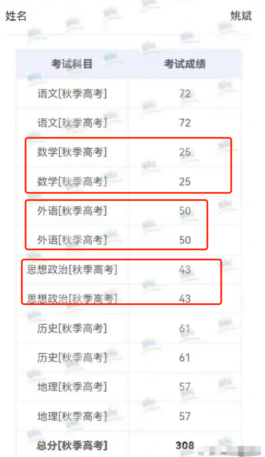 剩下的几位,均是分数不过400。尤其是姚景元,这位实际上已经复读一年了,去年考了300分,今年根据那个网传的分数,是308。也就是说,复读一年,分数增加了8分。但把他送上热搜的,不是这个总成绩,而是他的数学成绩。