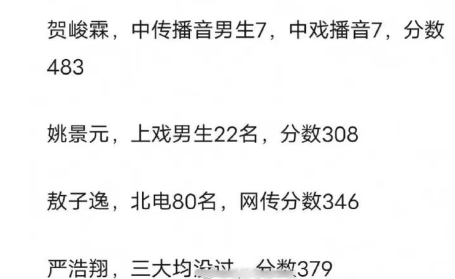 这几位,均是内娱著名养成系偶像团体的成员,有TF家族的,也有时代少年团的成员。这几位中,贺峻霖的分数算是比较高的,有483。有媒体和他的经纪公司联系,得到的回应说贺峻霖考得不错,但具体的就不说了。