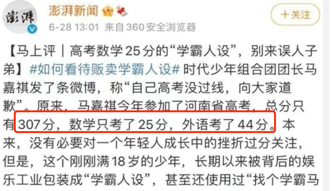 这个25分,是不是有似曾相识的感觉?他的队友马嘉祺参加了2021年的高考,成绩307,数学也是25分,外语44分。同样的,他也复读一年,但是,今年的成绩还没看到,不知道有没有比较大的进步?