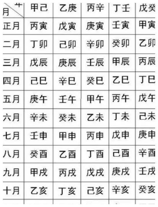 月天干可以从年天干推算,详细看下面的图表。例如,2021年是辛丑年,因此2021年12月25日(农历十一月廿二日)的月天干为庚,是庚子月。