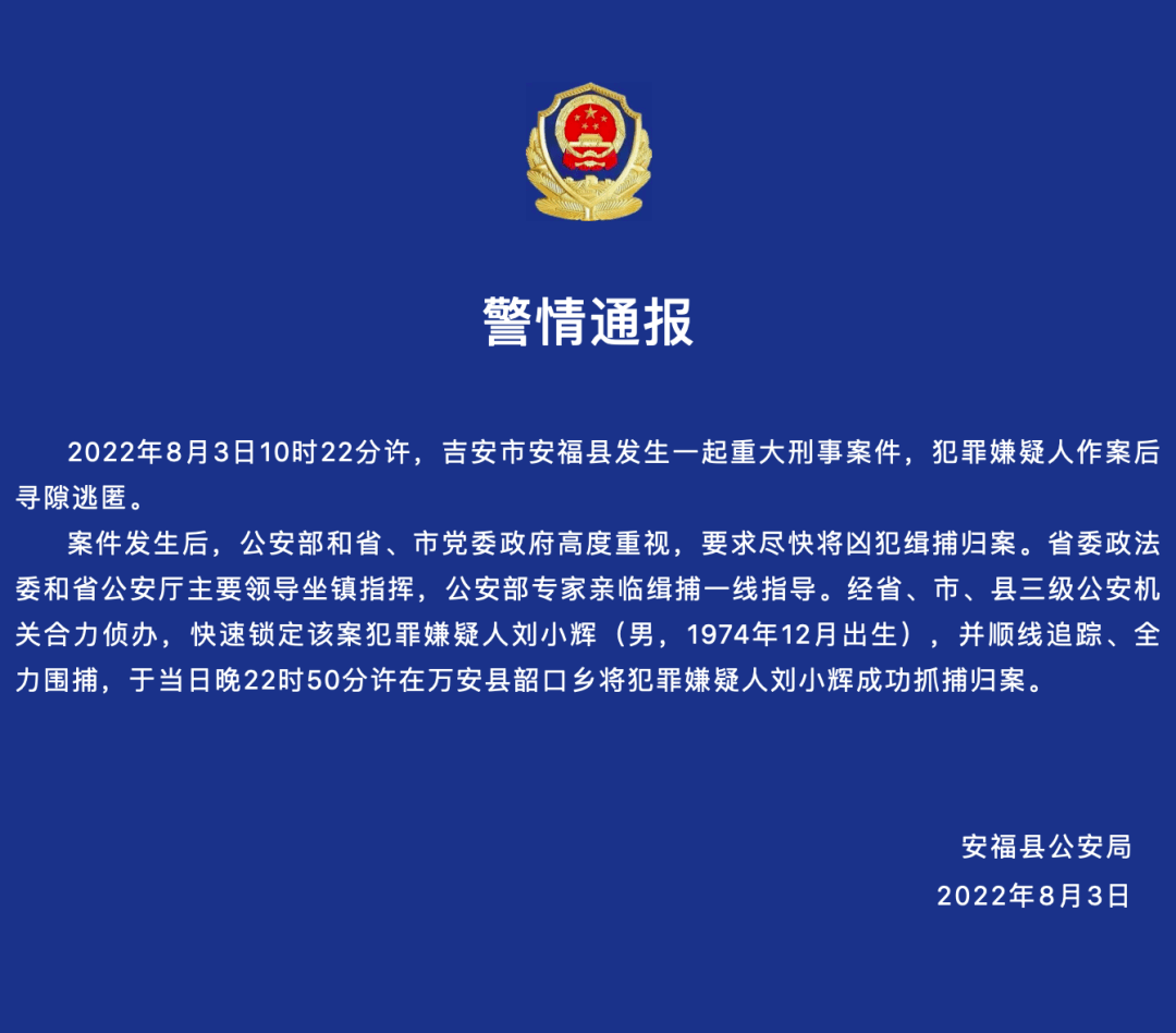 据央视消息,8月3日,江西省吉安市安福县一幼儿园重大刑事案件嫌疑人刘小辉在吉安市万安县被抓获。
